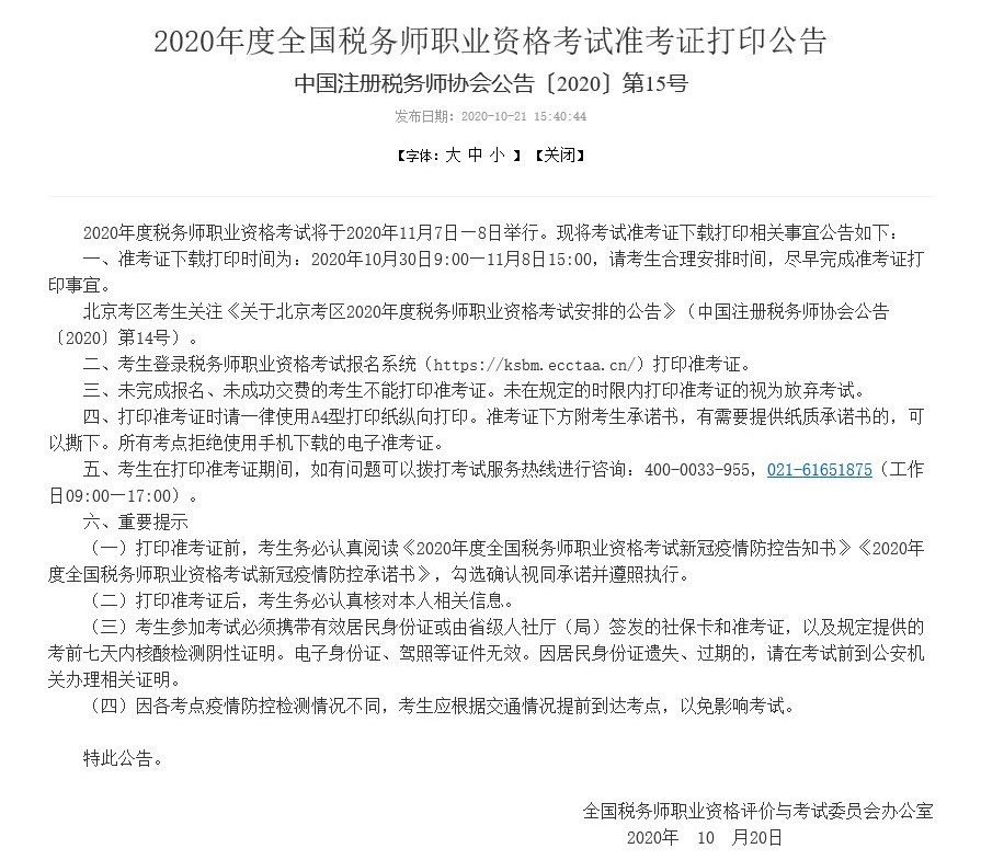 中国注册税务师协会2020年度全国税务师职业资格考试准考证打印公告